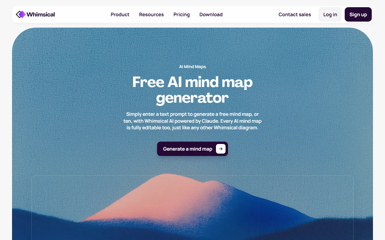 根据官网信息,Whimsical 的 AI Mind Map 功能可在几秒内帮助用户生成新想法、总结复杂信息,并且生成后的思维导图可以像普通 Whimsical 图表一样继续编辑和调整。产品基于 Claude 提供 AI 能力,并运行在 Whimsical 的可视化画布环境中。