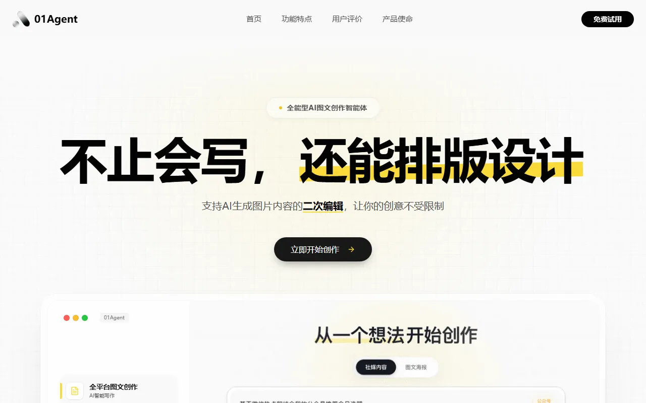 01Agent 是一款面向内容创作场景的 AI 图文创作智能体,覆盖选题、生成、排版、编辑到发布的完整流程。它主打“小红书图文、公众号长文、电商海报”等内容生产,结合多智能体协同与 AI 深度搜索,帮助用户用更少操作完成多平台内容制作。