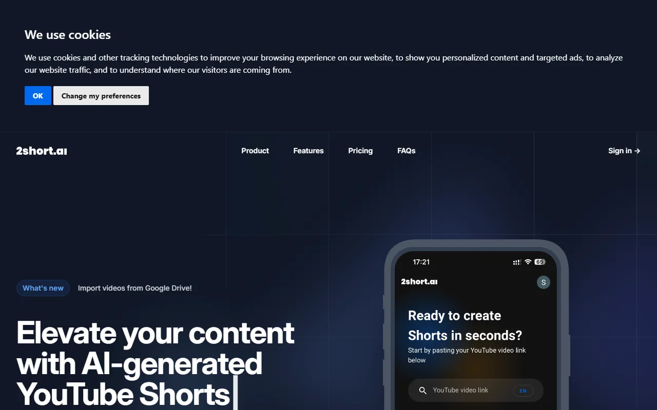 对于经常制作访谈、播客、解说、课程或其他长篇视频的创作者来说,2short.ai 的核心价值在于减少手动剪辑时间,并提升已有素材的复用效率。根据官网信息,工具还支持从 Google Drive 导入视频,方便用户管理素材来源。