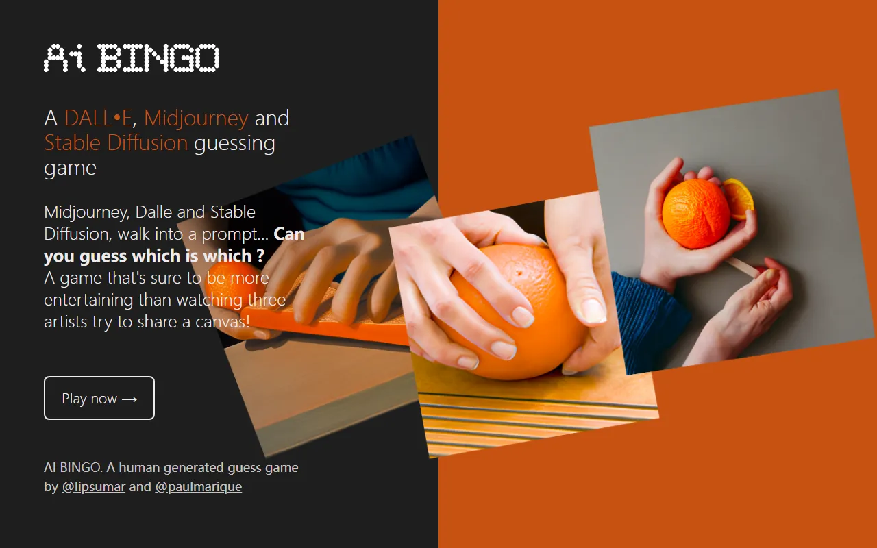 AI Bingo 是一款围绕生成式 AI 打造的轻量化猜谜游戏,主题聚焦于图像生成模型的风格辨识。玩家需要根据页面给出的图像内容,判断其更可能来自哪一种模型,例如 DALL·E、Midjourney 或 Stable Diffusion。