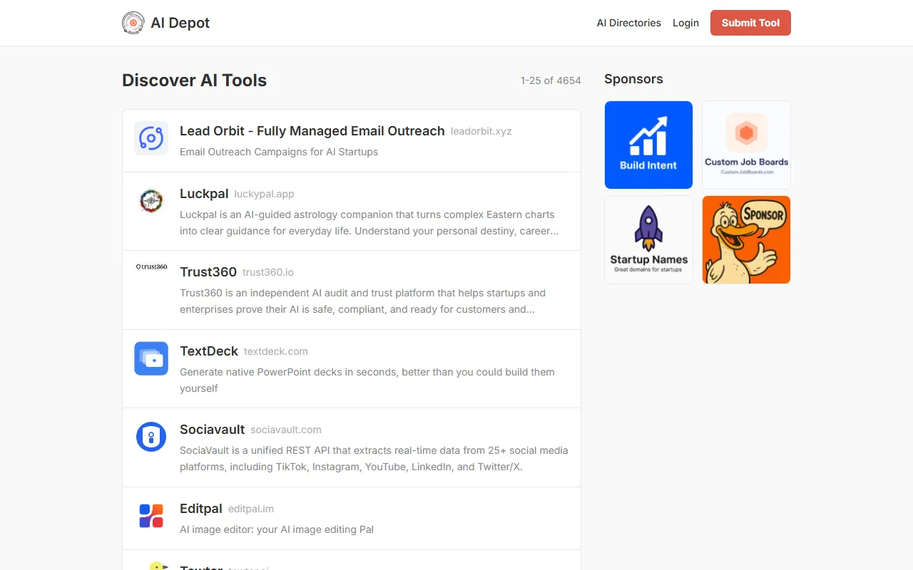 AI Depot 是一个面向企业与项目选型场景的 AI 工具导航平台,官网定位为“Discover the best AI tools for your business”。它主要通过聚合和展示大量 AI 产品,帮助用户快速发现适合业务需求的工具与方案。