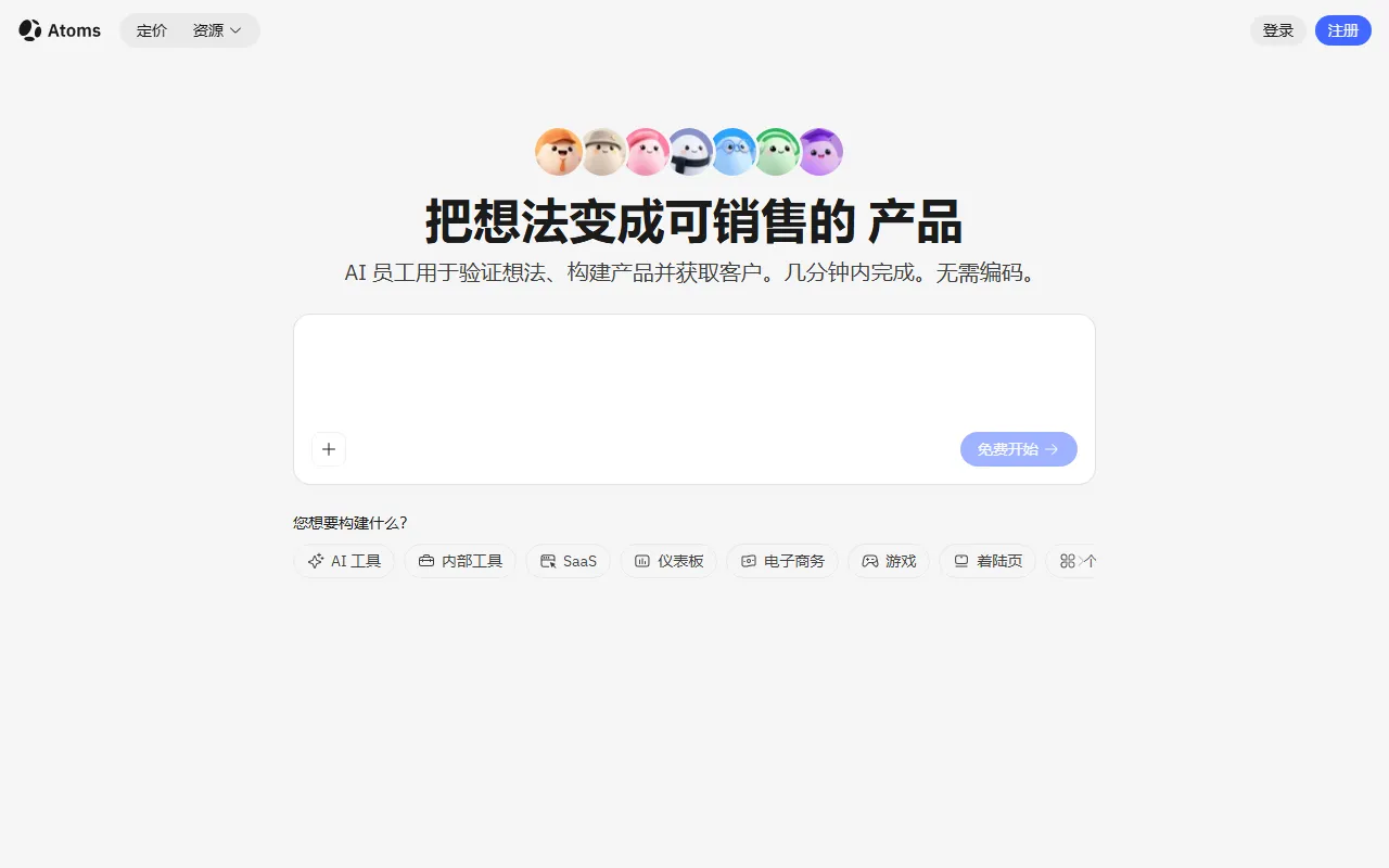 官网页面显示 “Start for free”,说明 Atoms 提供免费起步方案。