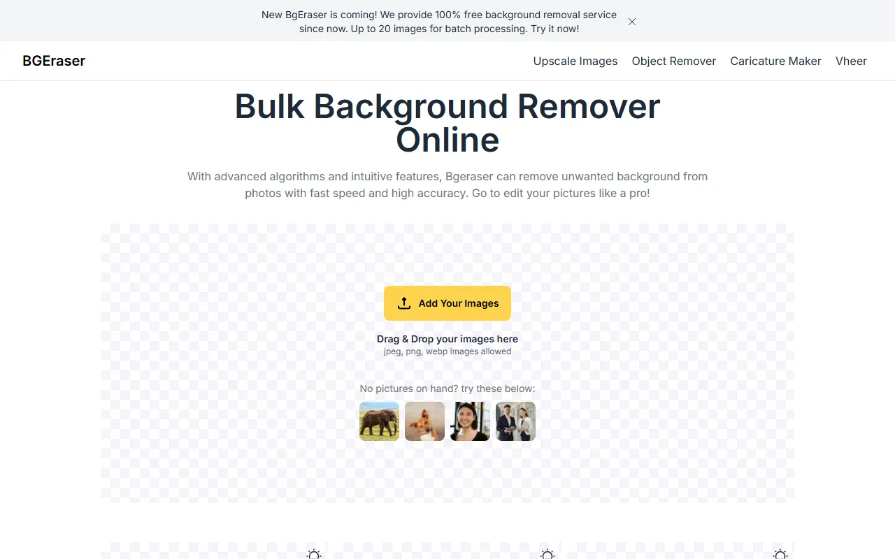 从官网信息来看,Bg Eraser 当前重点提供的是批量背景移除能力,而不仅仅是简单的“物体抹除”。它支持一次上传多张图片进行处理,并可将结果打包下载,能够在一定程度上提升图片编辑效率。对于希望快速获得透明背景图或统一背景色图片的用户来说,这是一种较为便捷的在线方案。