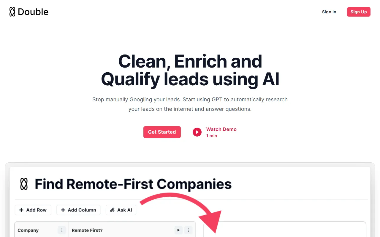 从官网信息来看,Double 的核心价值在于 Clean、Enrich、Qualify leads using AI:即用 AI 对线索进行清洗、信息补全和资格判断,帮助用户用更有针对性的方式寻找并转化潜在客户。