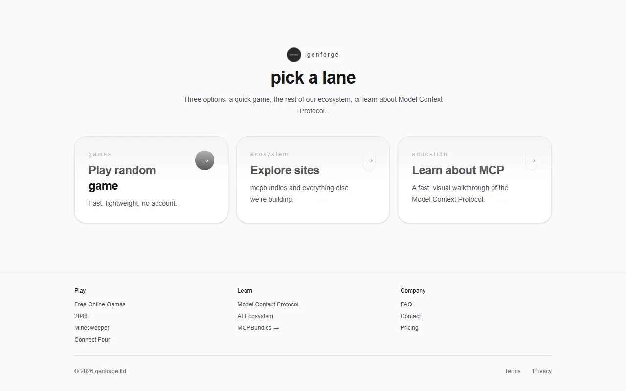 最新抓取到的官网首页更偏向展示平台生态、游戏与 MCP 教育内容,未完整呈现 GenForge 的详细功能页信息。因此,使用前建议结合官网最新页面进一步确认产品能力与适用范围。