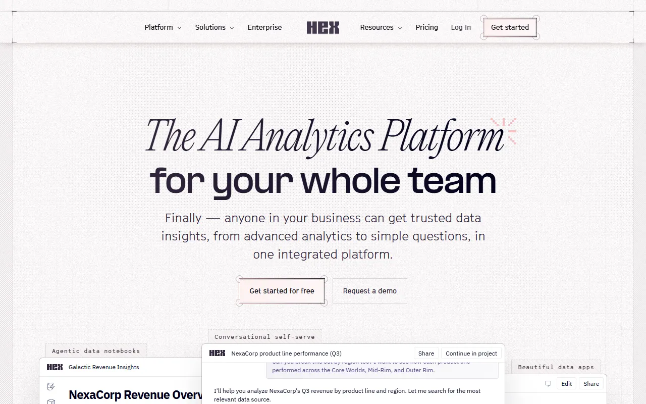 Hex 是一款面向团队的数据分析与数据科学平台,定位为 AI Analytics Platform。它将协作式分析笔记本、AI 辅助分析、对话式自助查询以及数据应用构建整合到同一系统中,帮助数据团队在一个统一环境里完成从探索分析、建模实验到结果展示和业务交付的完整流程。