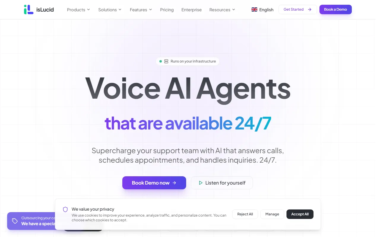 根据当前官网内容,isLucid 的主要定位已经转向 企业 AI 语音代理和呼叫中心自动化,而不再以会议记录整理为核心卖点。