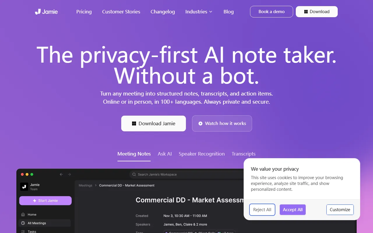 与传统会议纪要工具相比,Jamie 的特点在于更强调隐私保护与轻量接入:官方提到其采用 privacy-first 方案,支持 GDPR 合规、欧盟托管,并声明不会使用客户数据训练模型。对于需要频繁参加管理会议、客户沟通、内部协作讨论的个人或团队,Jamie 能帮助更快回顾讨论内容、提炼重点并减少手动记录负担。