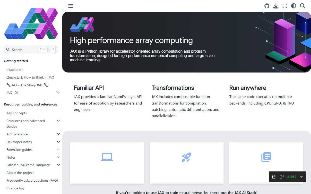 JAX 不只是计算库,还强调函数级变换组合,可用于构建更灵活的科研和工程计算流程。