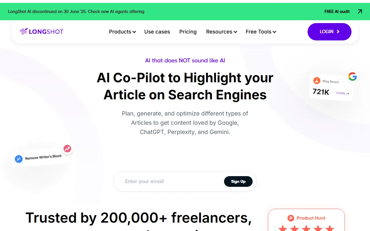 需要注意的是,官网抓取信息显示:LongShot AI 已于 2025 年 6 月 30 日停止服务(discontinued)。因此,用户在访问和评估该产品时,需优先确认当前可用状态及后续替代方案。
