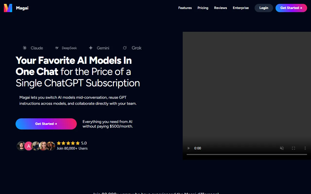 根据官网标题与页面文案,Magai 的卖点之一是 以接近单一 ChatGPT 订阅的成本,提供 50+ AI 应用或模型能力。