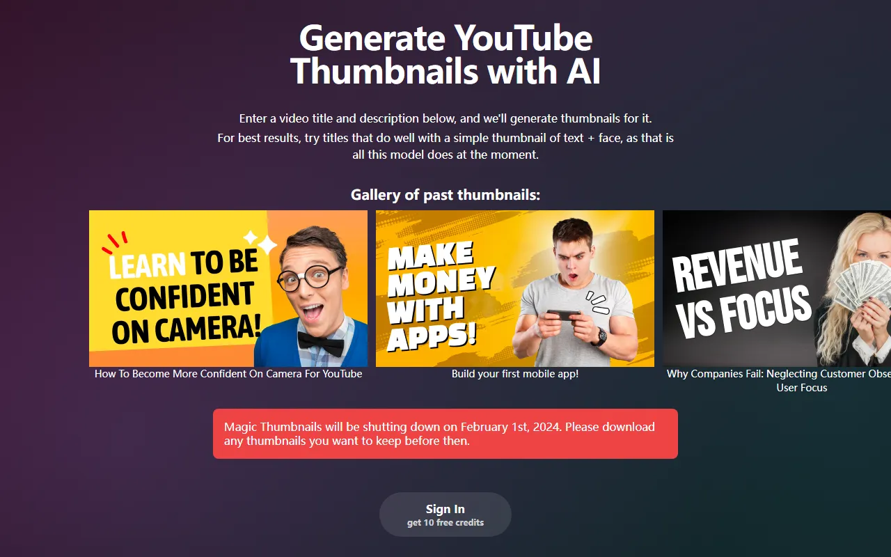 官网信息显示,Magic Thumbnails 将于 2024 年 2 月 1 日停止服务。因此当前是否仍可访问或继续生成图片,需要以官网实时状态为准。