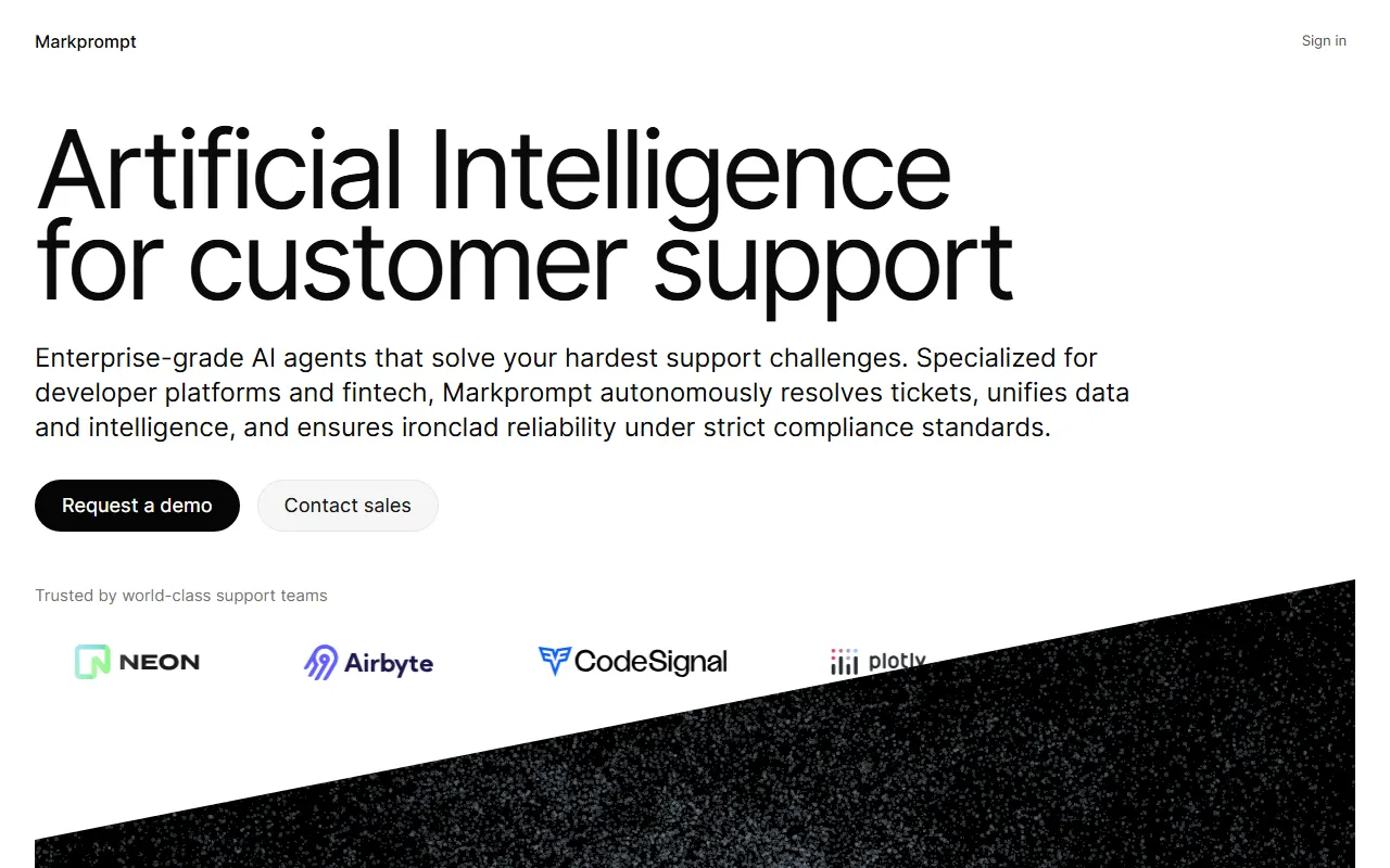 目前提供的官网抓取信息中未显示公开定价。从页面内容看,Markprompt 当前更偏向企业销售模式,主要入口为: