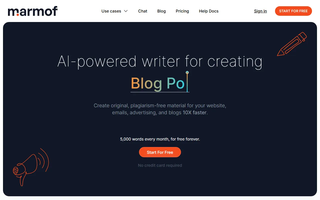 Marmof 是一款面向内容创作场景的 AI 写作与文本生成工具,主打快速生成博客文章、社交媒体内容、营销文案、电商文案和邮件内容。官网信息显示,它支持用户通过“选择用途 → 输入需求 → 点击生成”的流程,在较短时间内产出可直接修改和使用的文本内容。