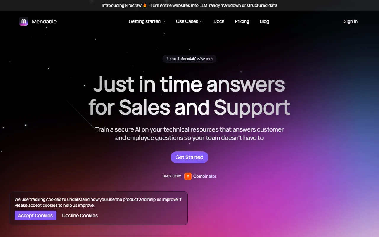 官网抓取内容中未提供明确的公开定价信息。当前可确认的是,Mendable 提供“Get Started”入口,并支持面向企业的安全与部署能力。若需了解套餐价格、调用额度、部署方式或企业方案,建议前往官网联系销售或注册后查看最新信息。