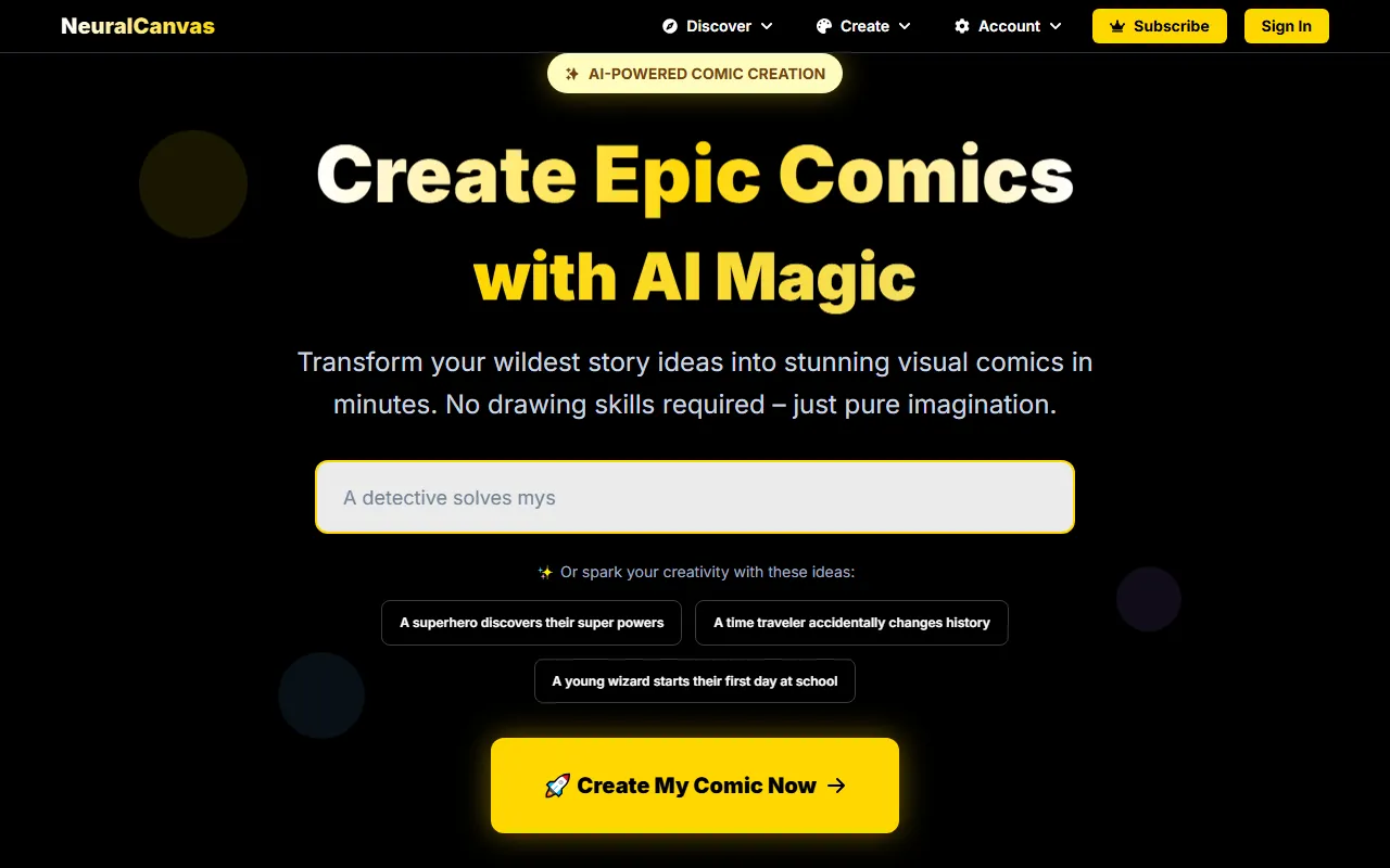从官网信息来看,Neural Canvas 重点强调 AI 漫画创作流程:用户可以围绕自己的故事想法创建角色与内容,由 AI 辅助生成漫画画面、对白气泡、连续剧情,并支持导出为电子书格式。该工具也适合用于博客配图、故事集插画、图像小说等场景。