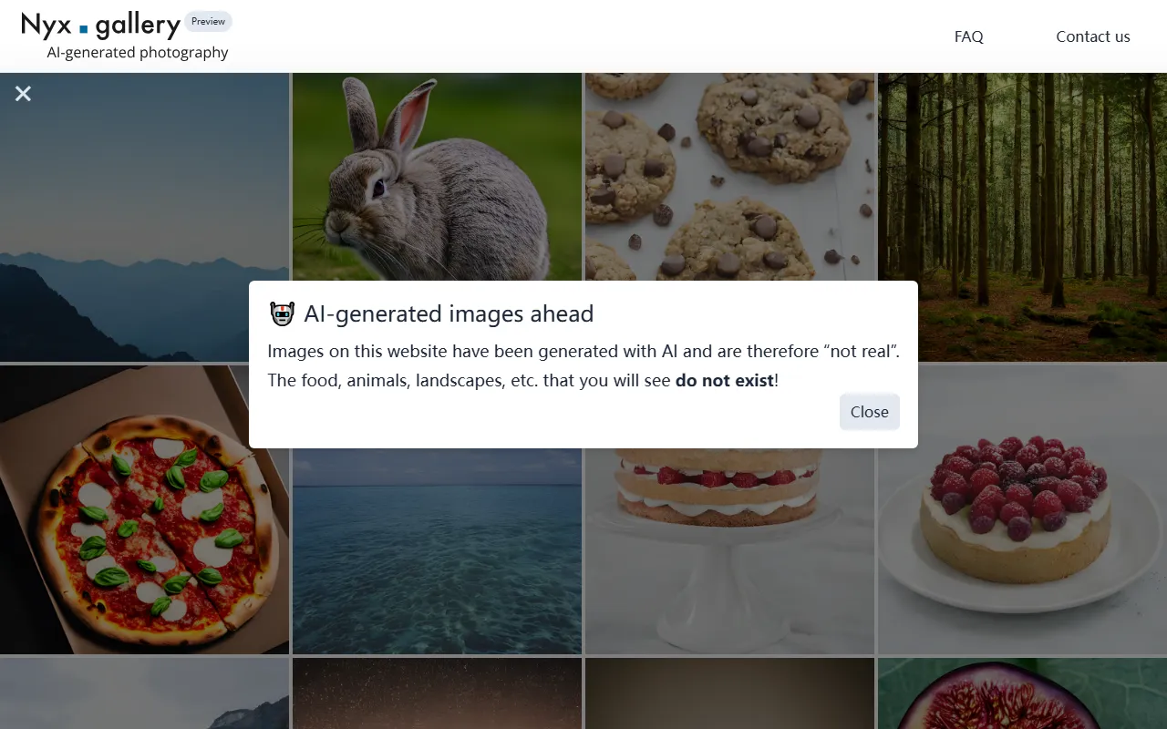 Nyx 是一个以 AI 生成摄影风格图像 为核心的在线展示项目,网站内容主要围绕“看似真实、实则不存在”的视觉作品展开。根据官网提示,站内展示的食物、动物、风景等图像均由人工智能生成,并非真实拍摄对象。
