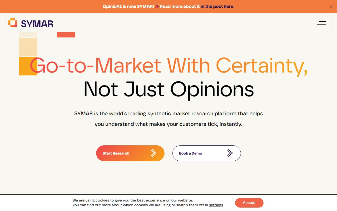 从当前抓取到的官网内容来看,原先的 OpinioAI 网站现已展示为 SYMAR 品牌页面,因此可理解为该产品当前以 SYMAR 名称对外提供服务。