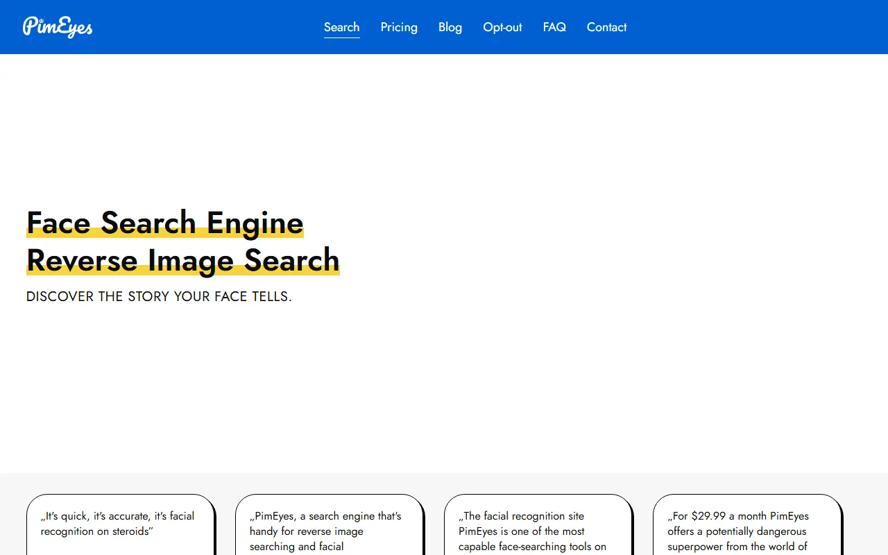 与普通的以整张图片内容为基础的搜图工具不同,PimEyes 更聚焦于面部特征匹配,适合用于个人照片曝光排查、肖像传播监测、网络身份追踪以及潜在的图片侵权检索等场景。根据官网信息,该产品的核心定位是“Face Recognition Search Engine and Reverse Image Search”,即结合人脸识别与反向搜图能力,帮助用户查找照片在网络上的出现位置。