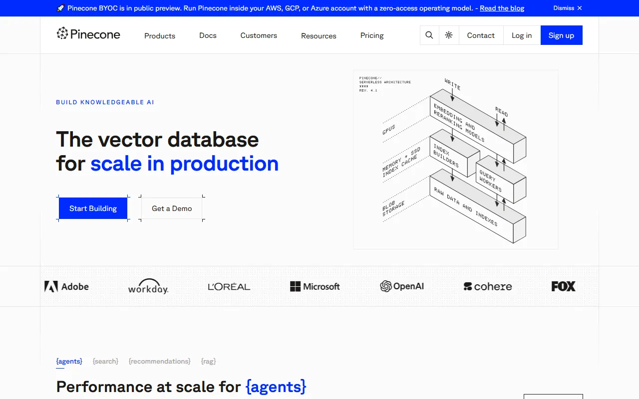 Pinecone 是一款面向生产环境的向量数据库,专为大规模相似度检索与知识型 AI 应用构建。它提供向量的存储、索引、更新与毫秒级检索能力,帮助团队将嵌入模型产生的向量结果快速接入实际业务,而无需自行搭建复杂的底层基础设施。