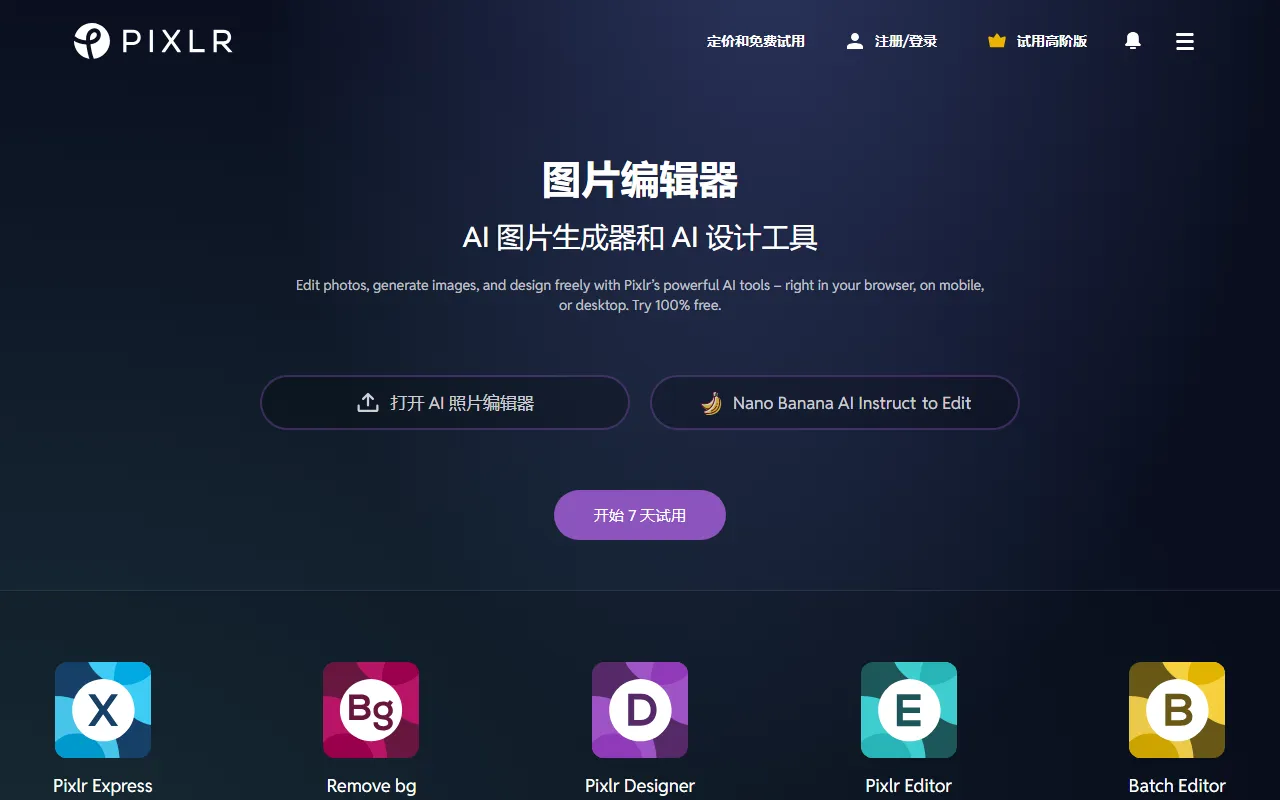 根据官网页面,Pixlr 提供免费试用,并出现了“开始 7 天试用”等信息,说明部分高级功能或完整功能可能采用订阅制。