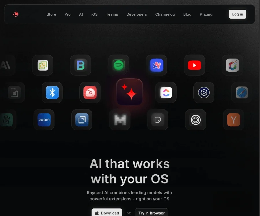 目前官网页面展示了 Download 与 Try in Browser 入口,但公开抓取内容中未明确列出 Raycast AI 的具体价格方案。