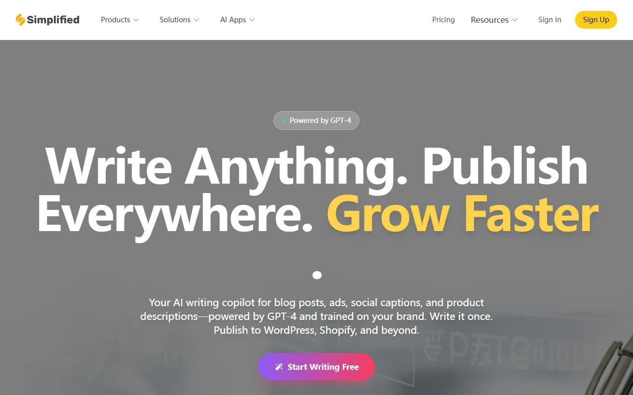 从官网信息来看,Simplified AI Writer 由 GPT-4 驱动,支持根据品牌语气进行训练,并可将内容直接发布到 WordPress、Shopify 等平台。它适合内容运营、市场营销、电商从业者,以及需要提升日常写作效率的个人用户,用于初稿生成、批量文案创作、选题拓展和基础长文写作等场景。
