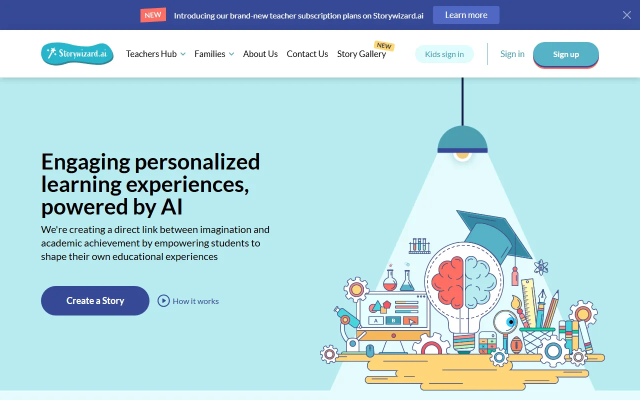 从官网最新信息看,StoryWizard 不只是故事生成工具,也是一款强调个性化教育体验的学习平台,兼顾阅读、写作和教学任务设计。
