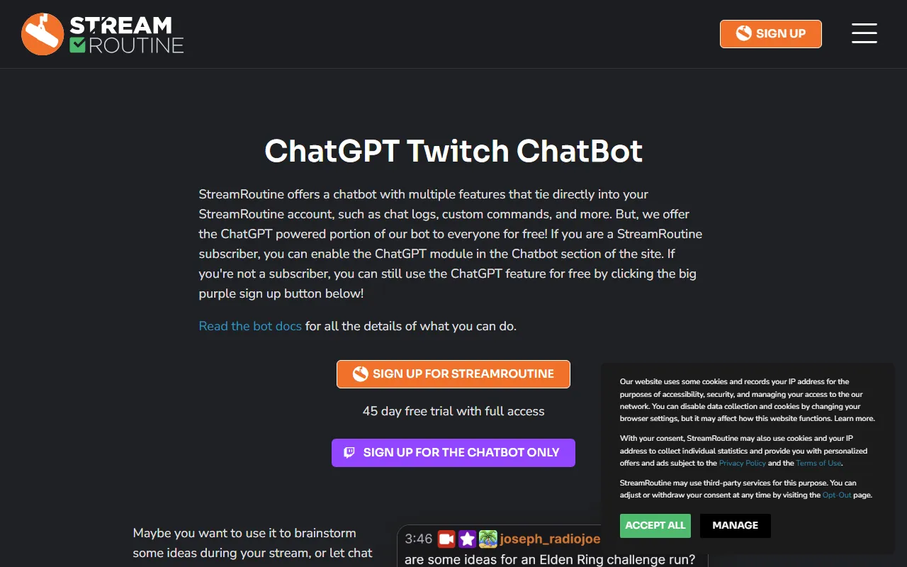 从官网信息来看,Stream Routine 当前重点提供的是 ChatGPT Twitch ChatBot。除订阅用户可在平台内启用完整模块外,官方也提供了可单独使用的 ChatGPT 聊天机器人入口,适合希望提升直播互动效率、增强观众参与感的主播使用。