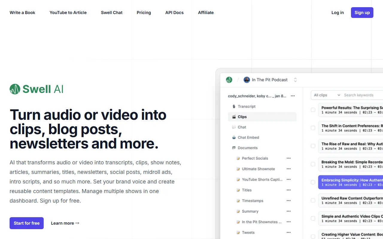 Swell AI 是一款面向音频与视频内容再利用的 AI 工具,主要帮助播客、访谈、课程录音或视频创作者,将原始媒体内容快速转换为适配不同营销渠道的文本与短内容素材。根据官网信息,它可以把音频或视频生成转录稿、剪辑片段、节目备注、文章、摘要、标题、新闻邮件、社交媒体文案等内容,并支持统一管理多个节目或项目。