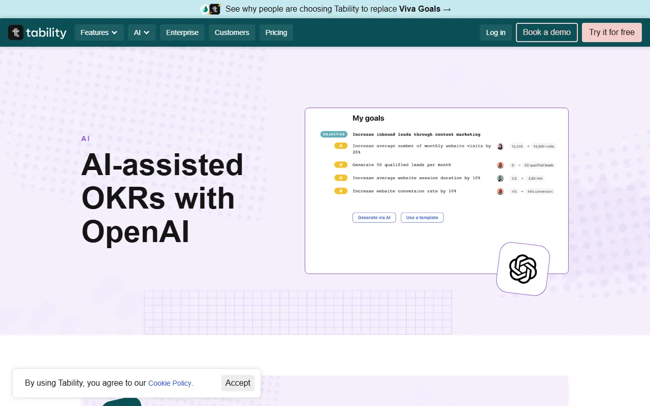 Tability 是一款面向团队目标管理的 OKR 工具,主打通过 AI 辅助提升目标设定、进度跟踪与团队协作效率。根据官网信息,Tability 已集成 OpenAI,可提供多项 AI 驱动能力,帮助团队更轻松地制定更清晰的目标,并在执行过程中获得建议与洞察。