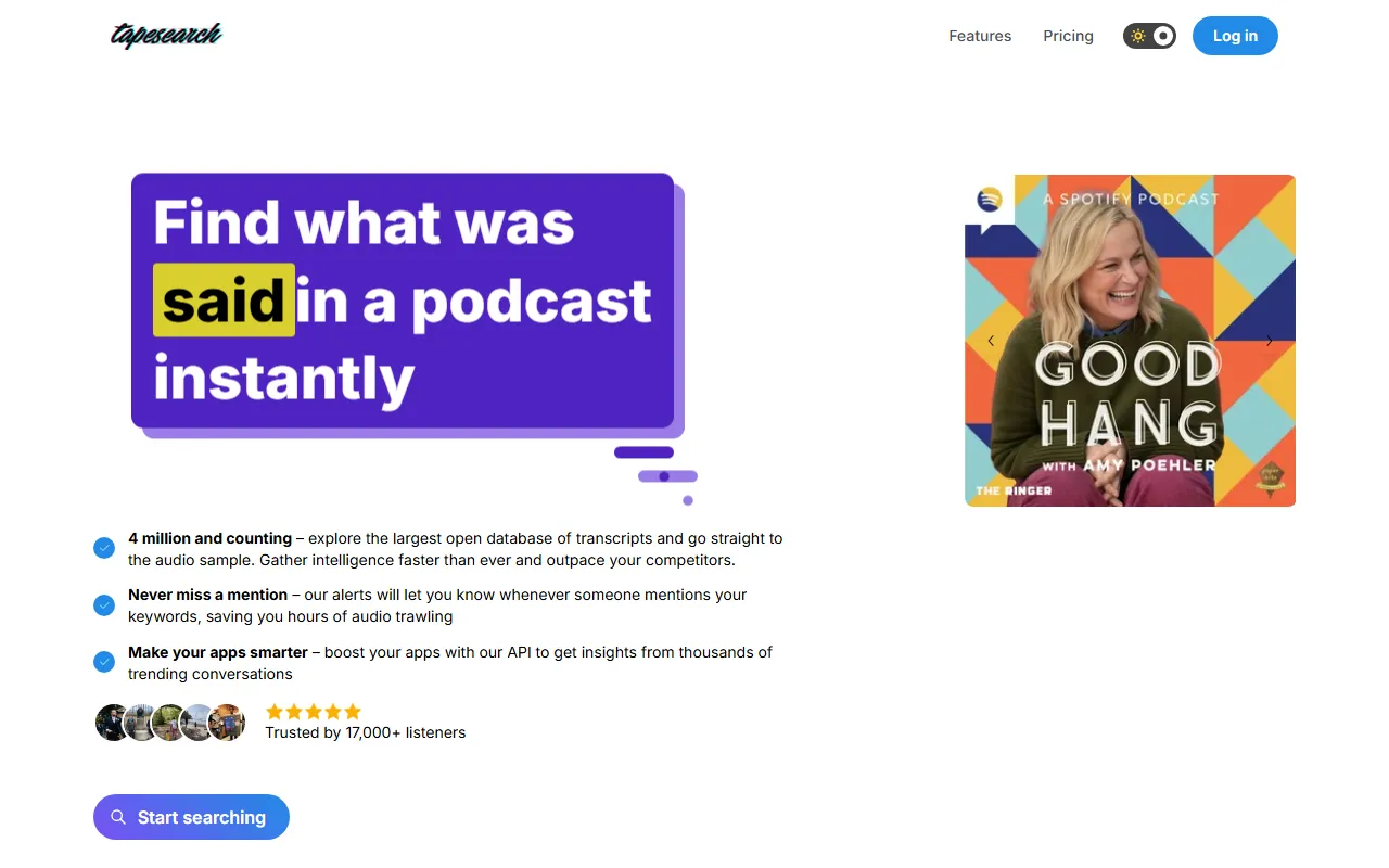 Tapesearch 是一款面向播客内容的 AI 搜索工具,专注于对播客转录文本进行快速检索与分析。它提供大规模开放播客转录数据库,帮助用户无需逐段收听长音频,也能迅速定位某个话题、关键词或具体讨论片段。