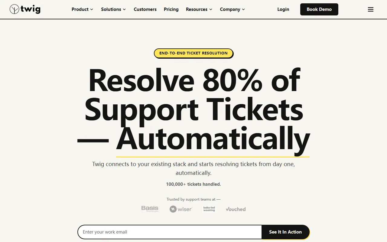 从官网信息来看,Twig 更强调“端到端工单处理”而不仅仅是辅助生成回复。其核心目标是帮助支持团队自动解决大量重复性、标准化的一级支持请求,例如计费、退款、技术咨询和升级处理等,从而降低人工客服负担、缩短响应时间,并提升客户服务效率。