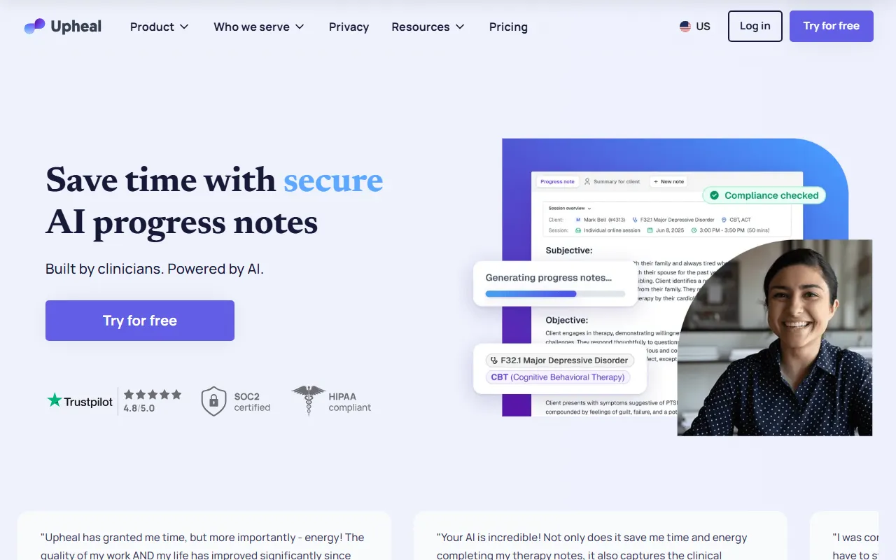 从官网信息来看,Upheal 的核心价值在于通过安全的 AI 笔记能力,加快会谈后的记录整理流程,并支持心理咨询、治疗会谈记录、个案跟踪以及远程会谈场景。对于需要频繁撰写 progress notes、进行线上咨询或管理日常诊所事务的治疗师、心理咨询师和相关临床人员来说,这类工具能显著提升工作效率。