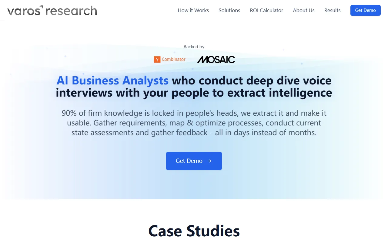 VarosAI(官网当前标题显示为 Varos Research)是一款面向企业研究与业务分析场景的 AI 工具,定位于通过 AI agents 加速信息发现、知识沉淀与决策输出。根据官网最新介绍,该产品通过快速的“微访谈(micro-interviews)”方式,从员工头脑中的隐性知识中提取关键信息,并整理为安全、私有的知识库,帮助团队更快形成可执行的业务结论。