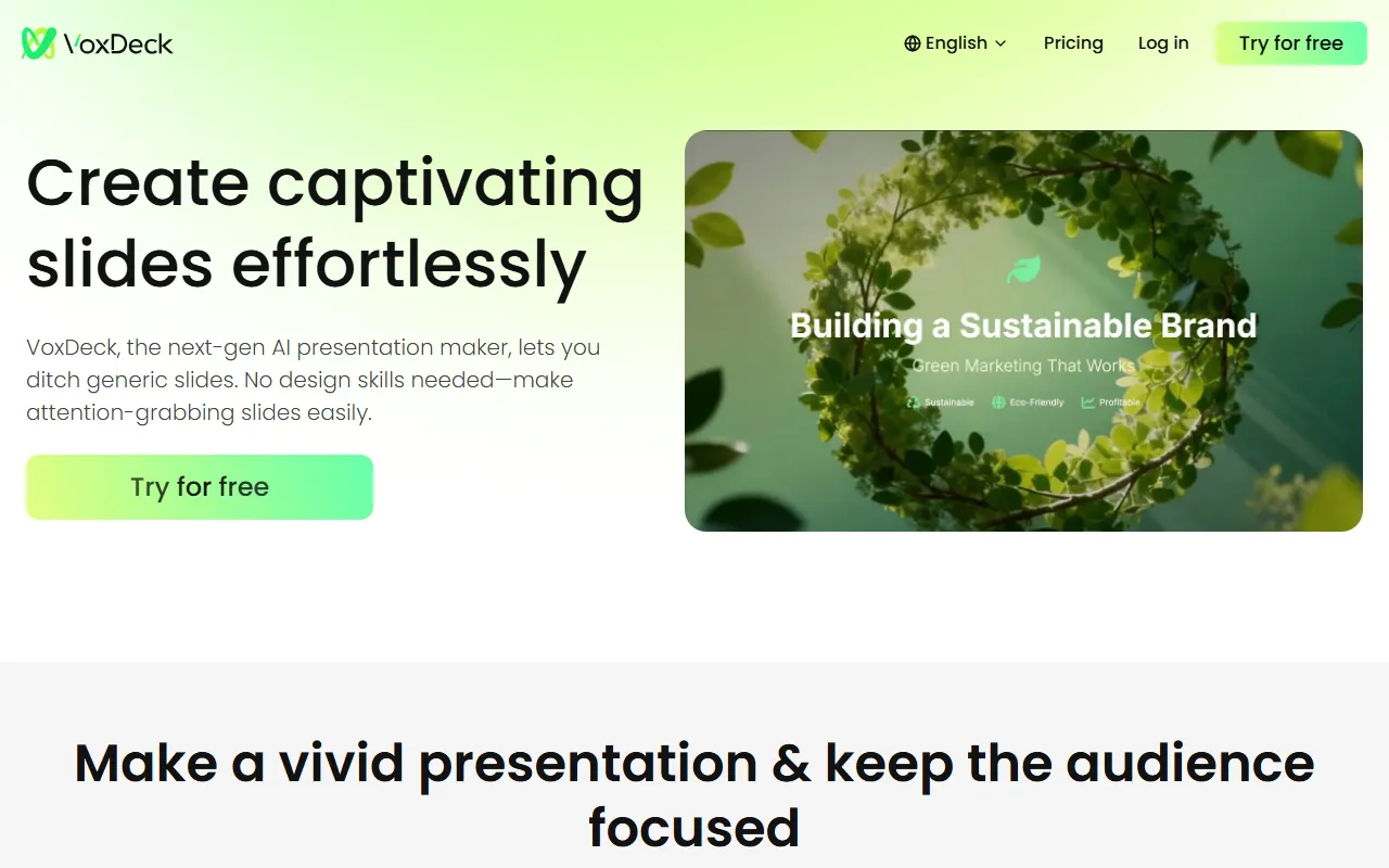 与传统 PPT 工具相比,VoxDeck 更强调“吸引注意力”的表达方式:不仅能生成动态页面,还支持更具沉浸感的视觉呈现与交互式展示,让演示内容从静态排版升级为更具叙事感的表达形式。对于没有设计基础的用户,也能较快完成可编辑的演示初稿。
