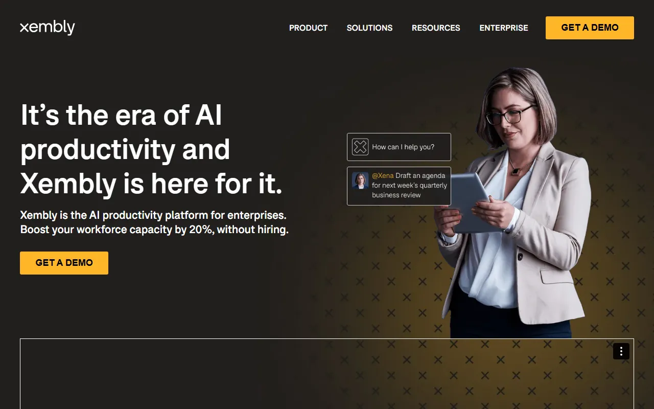 从官网信息来看,Xembly 的核心能力集中在会议调度、会议纪要、任务追踪和优先级管理等高频办公环节。其 AI 助手“Xena”更适合需要频繁协作、跨团队沟通、会议密集或任务较多的企业员工与团队使用。